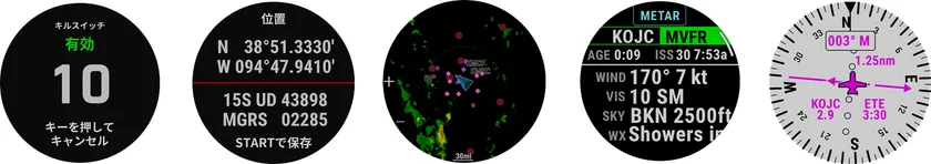 また、アビエーション(航空)機能は、NEXRADムービングマップや航空の標準であるMETAR&TAF気象レポートに対応し、プリロードされた世界空港データを元にフライトプランを作成。さらにフライトログを始め、水平位置指示器、高度アラートと血中酸素アラートを搭載し、独自アプリGarmin Pilotと同期しての活用が可能です。