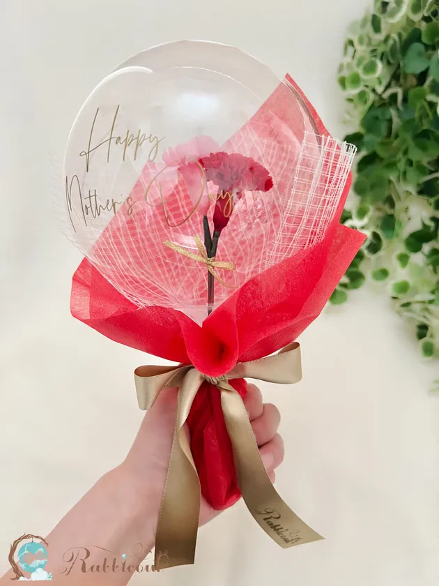 透明なバルーンの中にプリザーブドフラワーカーネーションを2輪入れたお洒落で心踊るデザインのお土産。ご帰宅後も含め、母の日の1日を素敵に演出するお土産特典付きのチケットとなっております。