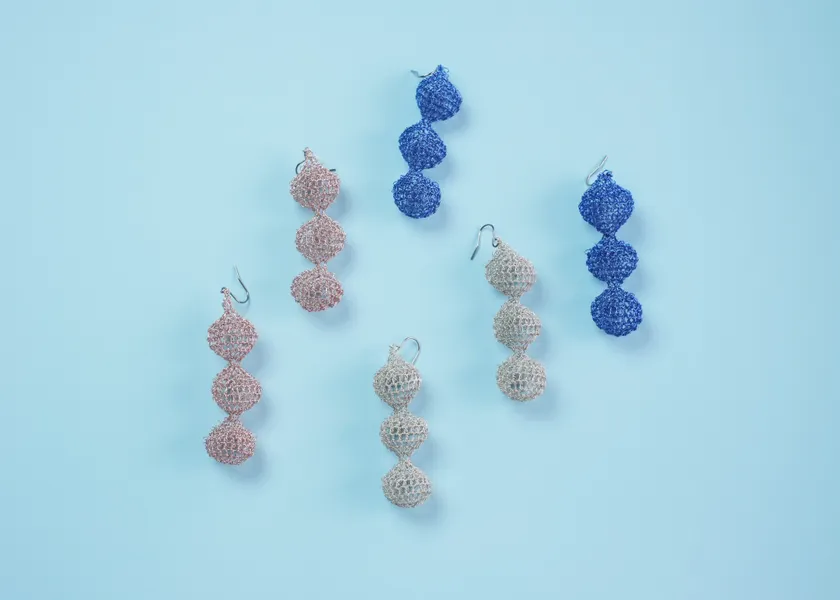 金属の細い糸を丸く編み上げた「ぷく」モチーフを縦に3つ連ねました。