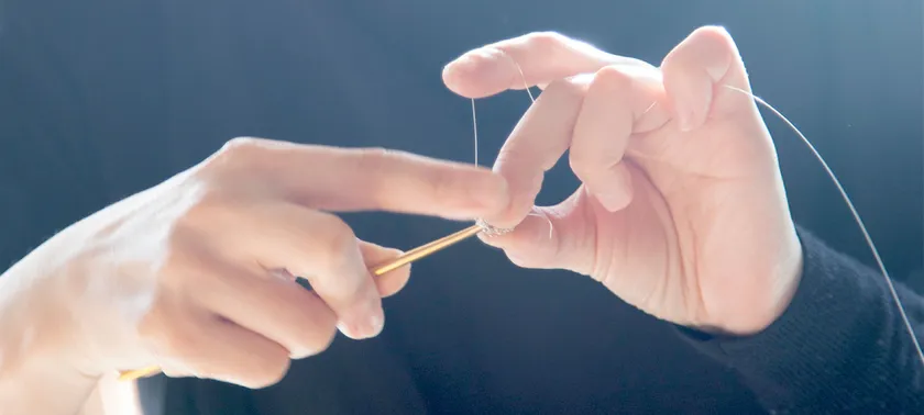 他ではなかなか見かけない銀線の繊細なクリエイティブは、Takahashi Naomiがロンドン留学時代に出会ったチェーンを作る技法をもとに試行錯誤の末確立したオリジナルの技法によるもの。