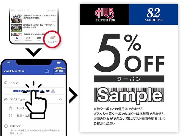 株式会社ハブ(本社:東京都千代田区、代表取締役社長:太田 剛)はHUB・82の一部店舗にて、株式会社ネットドリーマーズ(本社:東京都渋谷区、代表取締役社長:向江 俊和)が運営する競馬情報ポータルサイト「netkeiba.com」(ネットケイバ・ドット・コム)と、netkeibaスーパープレミアム会員のお客様を対象としたタイアップ企画を期間限定で開催いたします。本企画ではHUB・82の店舗で何度でもご利用いただける飲食5%OFFクーポンを期間限定で配信いたします。中央競馬のLIVE中継を放映中のHUB・82で、22年秋のGIレースを是非お楽しみください。