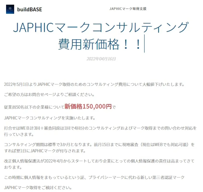 buildBASE(所在地:埼玉県越谷市、代表:常本 剛志、URL: https://buildbase.webnode.jp/ )は、JAPHICマークの第三者認証取得コンサルティングサービスの新価格での案内をはじめました。