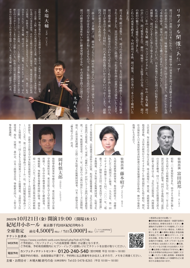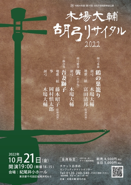 木場大輔 胡弓の会主催、『木場大輔 胡弓リサイタル2022』が2022年10月21日 (金)に紀尾井小ホール(東京都千代田区紀尾井町6番5号)にて開催されます。
