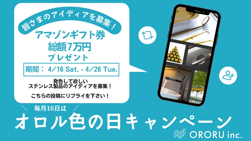 オロル株式会社では、世の中のステンレス製品に彩りを加えたいと思い、毎月16日を「オロル色の日」に制定しました。毎月16日はキャンプ用品からカトラリー類など様々な製品に彩りを加え、キャンペーンを実施しプレゼントをする予定です。2回目となる4月16日の企画では、発色アイディアを募集するキャンぺーンを実施いたします。「身近にあるステンレスの製品で色がついたらより楽しくなる物」、「彩りを加えて欲しい製品」をSNSで投稿していただいた方の中から、Amazonギフト券を総額7万円分プレゼントいたします。