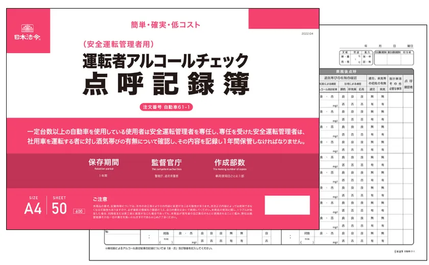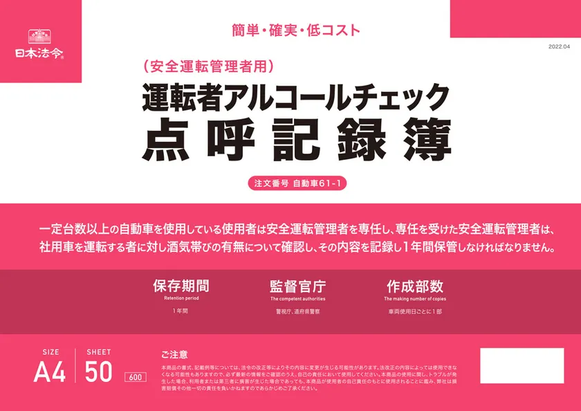 株式会社日本法令(代表取締役社長:青木健次、本社:東京都千代田区)は、2022年4月1日施行の道路交通法の改正に対応した『運転者アルコールチェック点呼記録簿』を、2022年4月18日より販売開始しました。
