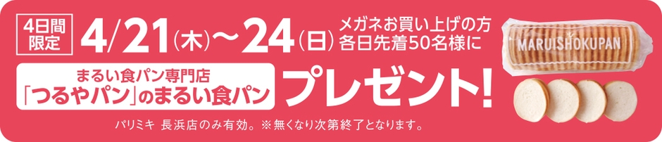 4/21(木)~24(日)の4日間 長浜店限定で、メガネお買い上げの方 各日先着50名様に「つるやパン」のまるい食パンをプレゼントいたします!