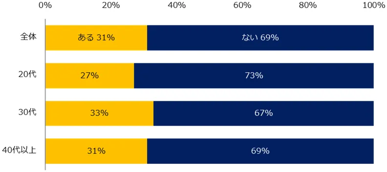 「テレワーク制度を使って働いたことはありますか?」と伺うと、31%の方が「ある」と回答しました。新型コロナウイルス感染拡大前の2019年に実施した調査では3%の方が「ある」と回答しており、コロナ前と比較すると10倍の結果になりました。年代別でみると、30代が33%と全体平均を上回りました。
