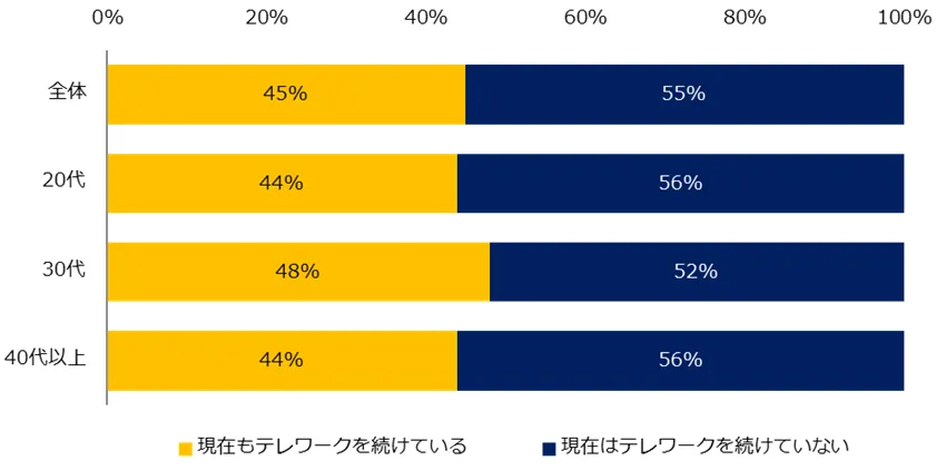 テレワークの経験がある方に「現在もテレワークを続けていますか?」と伺うと、45%が「現在もテレワークを続けている」と回答しました。半数以上が現在はテレワークを行なっていないことから、テレワークの定着には時間がかかることがうかがえます。