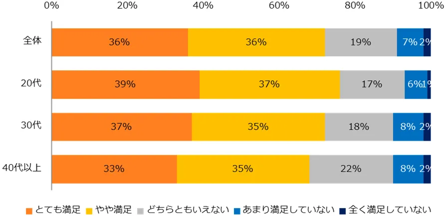 また、満足度も合わせて伺うと、7割が「満足している」(とても満足:36%、やや満足:36%)と回答し、「満足していない」方は10%以下にとどまりました。