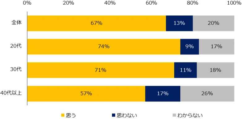 「今後、テレワークで働きたいと思いますか?(働いたことがある方は、引き続き働きたいと思いますか?)」と伺うと、67%が「思う」と回答しました。年代別でみると20代・30代が全体平均を上回り、若い世代ほどテレワークを希望することがわかりました。