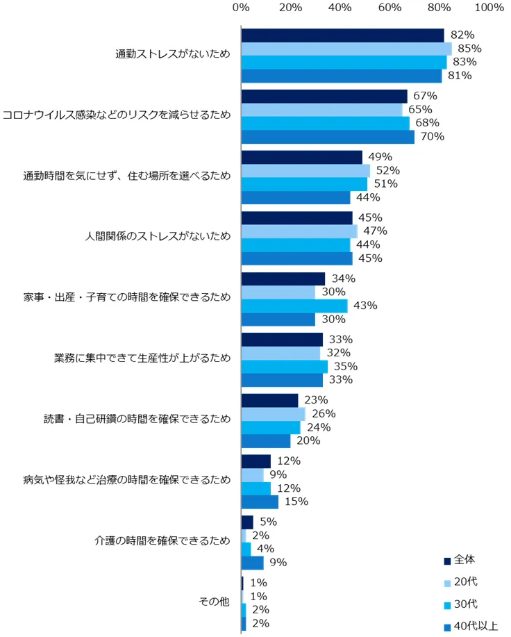「今後もテレワークで働きたい」と回答した方に理由を伺ったところ、トップ3は「通勤ストレスがないため」(82%)、「コロナウイルス感染などのリスクを減らせるため」(67%)、「通勤時間を気にせず、住む場所を選べるため(49%)」でした。