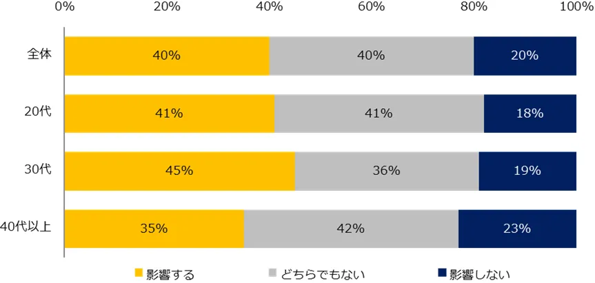 「テレワークができることは、転職先を選ぶ上で影響しますか?」と伺うと、4割が「影響する」と回答しました。次いで、「どちらでもない」(40%)が同率で一位の結果に。「影響しない」と回答した方は最も少なく、20%でした。年齢別でみると、30代が45%と最も高い結果になりました。