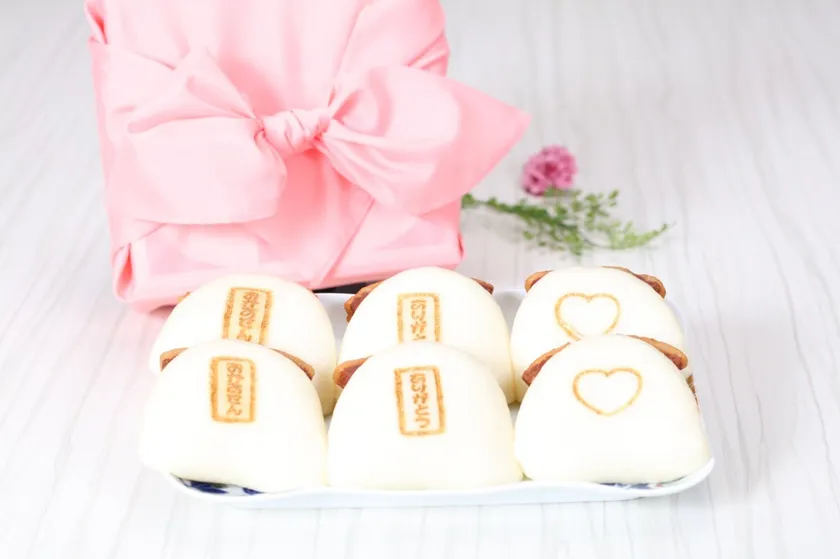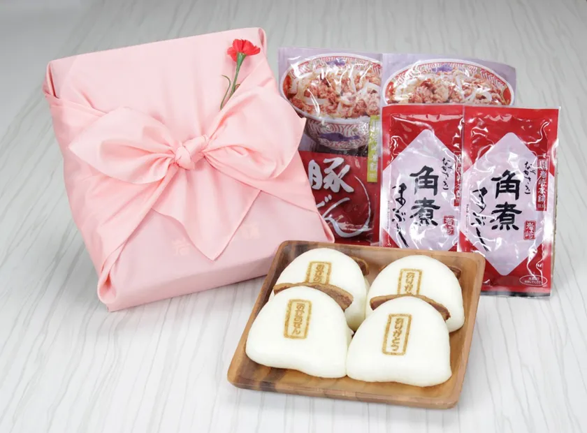 角煮まんじゅうが大好きなお母さん向けの商品です。「おかあさん」「ありがとう」「ハート」の特別な焼印の角煮まんじゅうをご用意いたしました。さわやかで可愛いピンク色の風呂敷に包み、お届けいたします。贅沢に角煮まんじゅうを味わえるセットです。