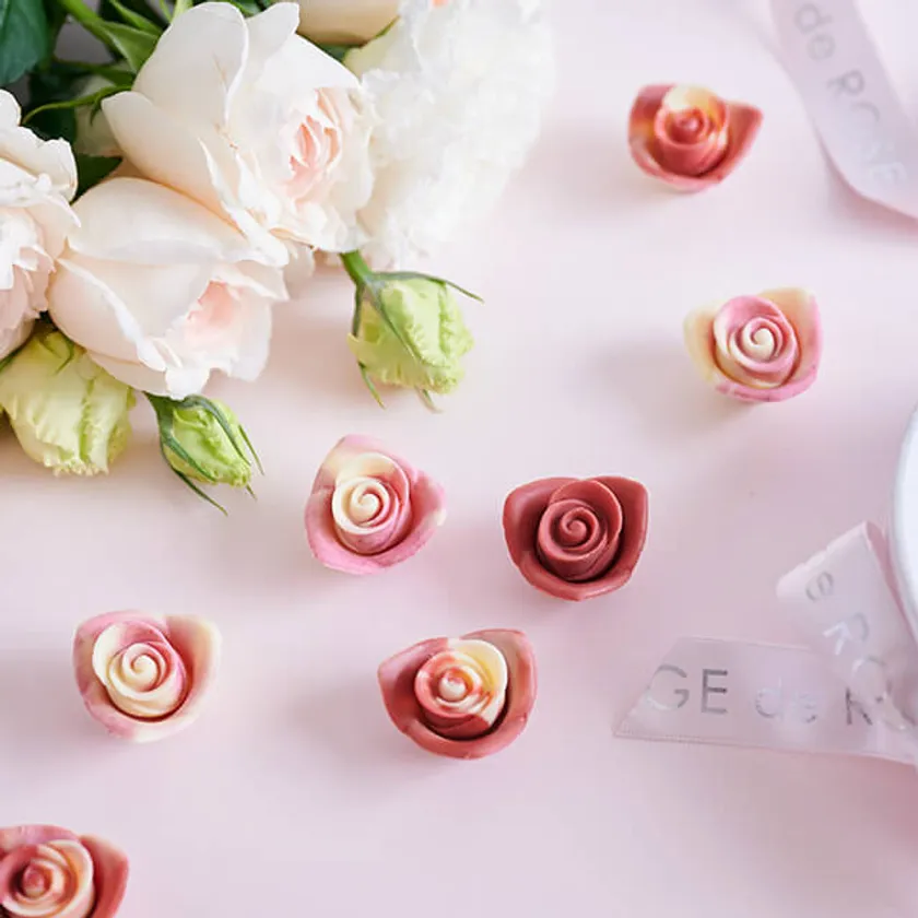 白いレース箱が上品。ブランドを象徴する薔薇の花びらを1枚1枚食べるような柔らかな口どけをお楽しみください。