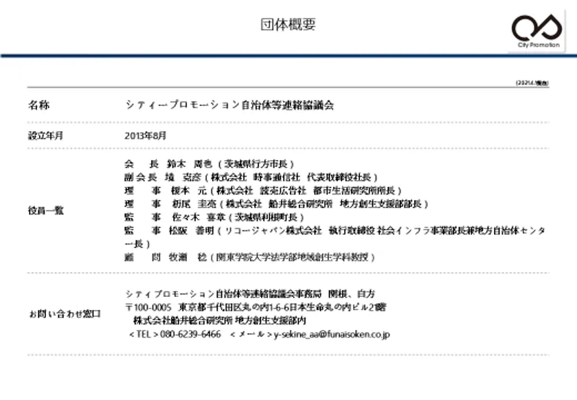 ・本協議会はシティープロモーションに関する自治体・民間企業におけるシティプロモーションに関する取り組みの推進及び意見交換を目的として2013年に設立された任意団体である。