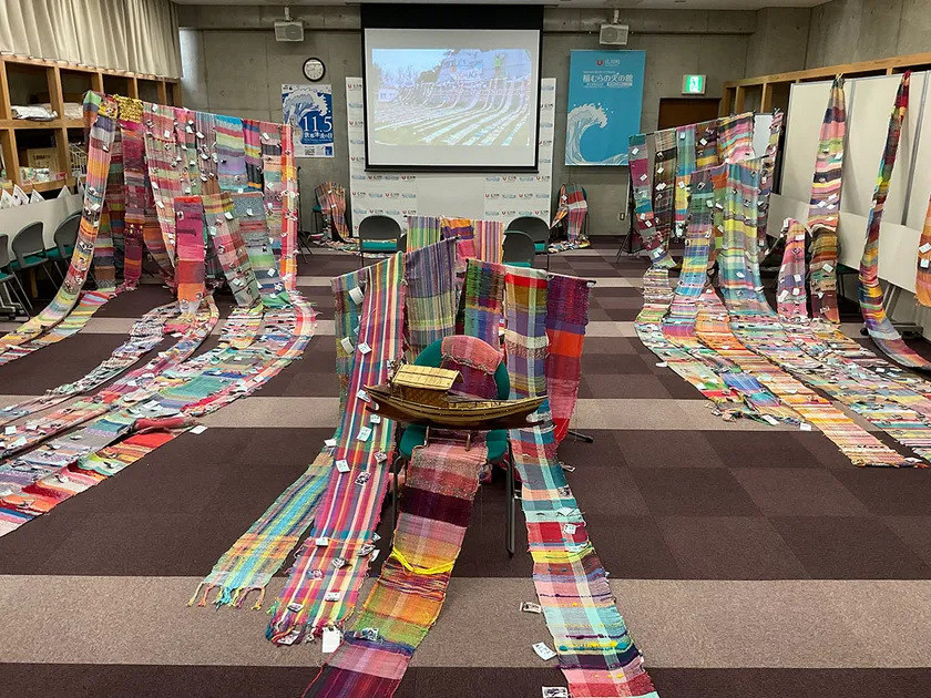 当日のたて糸は、岩手県の大槌はた織連合会が用意したものです。また、大きな水害があった人吉や海底火山噴火による災害にあったトンガなど、様々な繋がりをする催しとなっています。