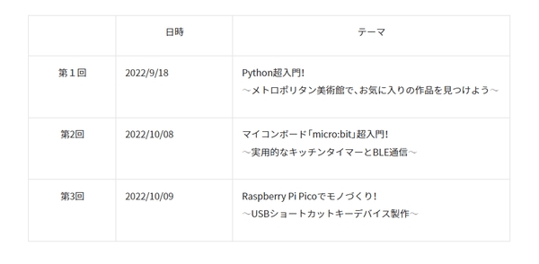 プログラムでは、「Pythonプログラミング」「マイコンボードmicro:bit」「Raspberry Pi Pico」の3つをテーマに、AI・IoT機器の基本的な知識習得に加えて、技術を体験する機会を設けます。