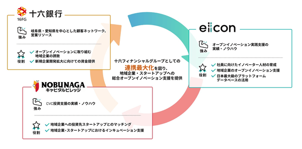日本最大級のオープンイノベーションプラットフォーム「AUBA(アウバ)」を運営する株式会社eiicon(エイコン 本社所在地:東京都文京区後楽、代表取締役社長:中村 亜由子、以下「eiicon」)は、株式会社十六銀行(本店所在地:岐阜県岐阜市、取締役頭取:石黒 明秀、以下「十六銀行」)、NOBUNAGAキャピタルビレッジ株式会社(本社所在地:岐阜県岐阜市、代表取締役:峠 清孝、以下「NOBUNAGAキャピタル」)と業務提携し、共同で地域に向けたオープンイノベーション支援を開始することをお知らせします。