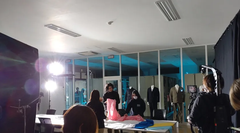そうして織りあがったテキスタイル(織物)は様々な製品へと姿を変えて世の中に出ていくのですが、今回のCMではモデルの桜木那智さん・一ノ瀬陽鞠さんが着用する洋服に仕上がったという設定。