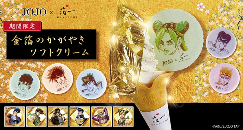 この度、株式会社箔一(本社:石川県金沢市、代表取締役社長:浅野 達也)と、アニメシリーズ「ジョジョの奇妙な冒険(以下 ジョジョ)」とコラボした「金箔のかがやきソフトクリーム(以下 金箔ソフト)」と「金沢箔コンパクトミラー」を4月29日(祝・金)より発売いたします。