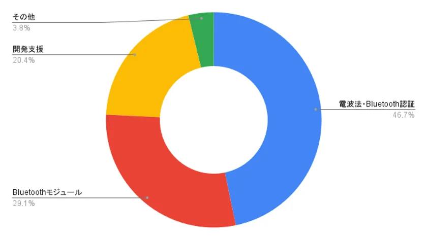 『電波法・Bluetooth認証』に関するお問い合わせが全体の約半数(46.7%)を占めており、昨今の半導体不足にまつわるトラブルのご相談も、多くはこの『電波法・Bluetooth認証』の分野に該当します。