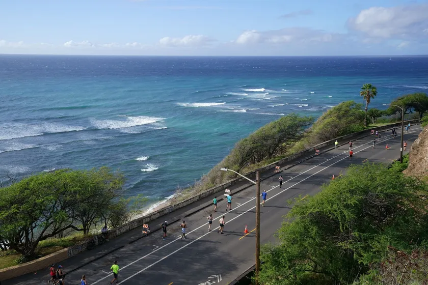 アラモアナ公園をスタートした後、世界的に有名なワイキキビーチ、ダイヤモンドヘッドを経てハワイカイで折返し、カピオラニ公園でフィニッシュするという、壮大なシーサイドコースです。コースの高低については、ダイヤモンドヘッド付近の短い坂を除けば、ほとんどが平坦で走りやすいコースになっています。