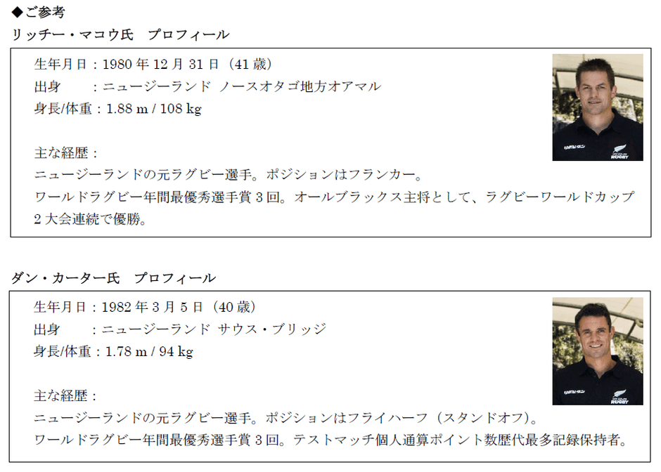 「リポビタンアンバサダー」となるリッチー・マコウ氏、ダン・カーター氏は、世界最高峰のラグビー文化に触れる機会を日本国内で創出すべく、ラグビークリニック開催やラグビーファン拡大へ向けた企画を実施していく予定です。今後も当社はアンバサダーの方々とともに、日本ラグビー界全体の発展を支援する様々な取り組みを行ってまいります。