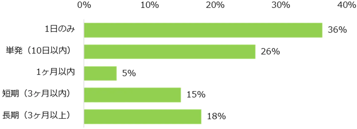 登録制バイトの経験者に「初めて登録制バイトに応募した際の職種は何でしたか?」と伺うと、トップは「軽作業」(39%)でした。次いで、「事務・オフィスワーク」(13%)、「接客・販売」(12%)、「製造・ラインスタッフ」(12%)が続きます。また、「初めて登録制バイトに応募した際の勤務期間はどれくらいでしたか?」と伺うと、「1日のみ(36%)」が最多でした。