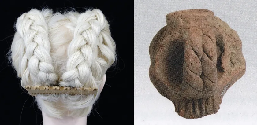 縄文時代を代表する遮光器土偶からは髪の束を四方から寄せて中央でまとめた髪型で再現。