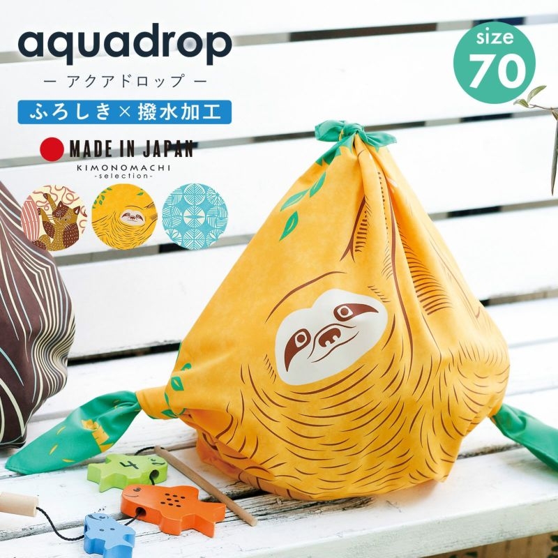 鮮やかなイエローの地。四隅はグリーンの葉。茶色の線で表現された背中合わせの2組のナマケモノの親子。個性的でユーモラスな雰囲気の風呂敷。