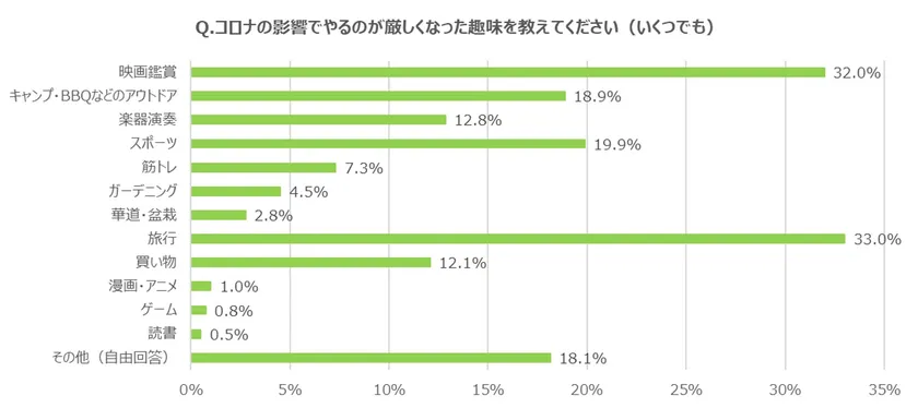 また、今回は住居形態と「コロナ禍の趣味」との関係についても調査を実施。持ち家の戸建てにお住まいの方と、それ以外の方(持ち家のマンションにお住まいの方や賃貸住居にお住まいの方)とに分け、後者に「コロナの影響でやるのが厳しくなった趣味がありますか」と尋ねたところ、約半数(53.5%)の方が「はい」と回答。この方たちに「やるのが厳しくなった趣味」について具体的に聞いたところ、1位が旅行(33.0%)、2位が(映画館での)映画鑑賞(32.0%)、3位がスポーツ(19.9%)という結果になりました。