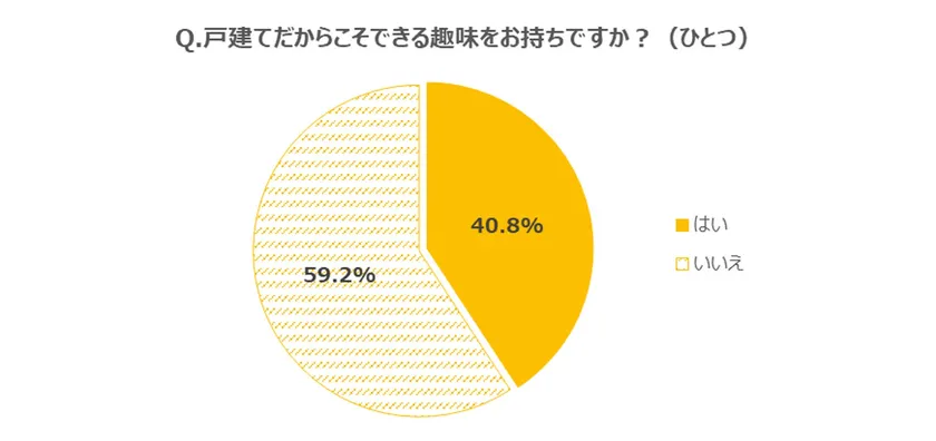 一方、持ち家の戸建てにお住まいの方を対象に、「戸建てに住んでいるからこそできる趣味があるか」を聞いたところ、4割が「はい」(40.8%)と回答。「戸建てだからこそできる」と考える理由については「音を気にしなくてよい」(サラウンドサウンドでの映画鑑賞、筋トレマシーンや有酸素運動の際の騒音など)という点と、「庭がある」(庭でBBQが楽しめる、テントを設営できる、ガーデニングが思う存分楽しめるなど)という点を挙げる人が多くみられました。