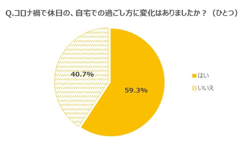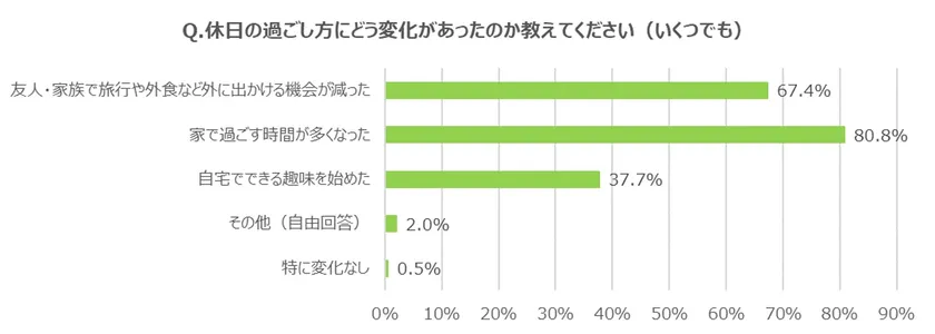 今回の調査で、「コロナ禍で休日の、自宅での過ごし方に変化があったか」を聞いたところ、約6割の人が「変化があった」(59.3%)と回答し、「どういう変化があったのか」を尋ねたところ、「家で過ごす時間が多くなった」(80.8%)、「友人・家族で旅行や外食など外に出かける機会が減った」(67.4%)、「自宅でできる趣味を始めた」(37.7%)という回答になりました。