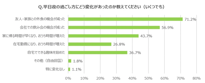 一方、「コロナ禍で平日夜の、自宅での過ごし方に変化があったか」を聞いたところ、休日と同じく約6割の人が「変化があった」(55.7%)と回答。変化の内容については「友人・家族との外食の機会が減った」(71.2%)、「会社での飲み会の機会が減った」(56.9%)、「家に帰る時間が早くなり、おうち時間が増えた」(43.7%)という結果になりました。