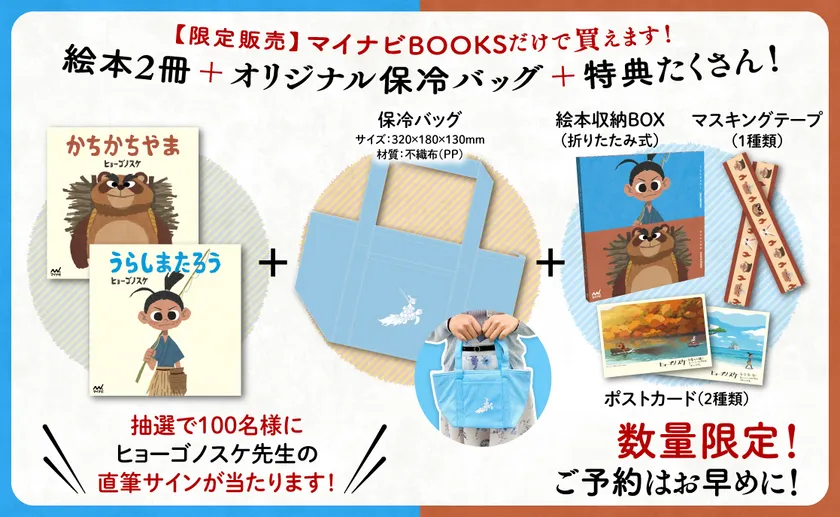 株式会社マイナビ出版(本社:東京都千代田区)は、人気イラストレーターのヒョーゴノスケ氏による絵本『うらしまたろう』『かちかちやま』の刊行を記念し、オリジナル特典付きの『うらしまたろう+かちかちやま』特別セットを数量限定で販売いたします。Webサイト「マイナビブックス」および「amazon.co.jp」での限定販売で、それぞれ異なる特典が付属したセットとなります。
