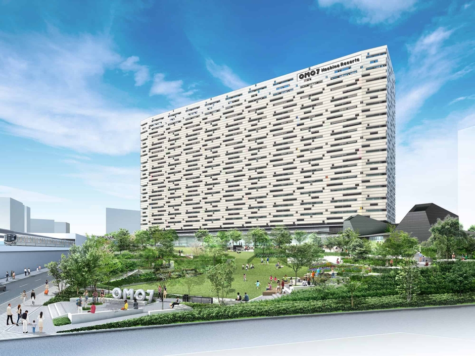 当施設は、「ほれてまうわ、なにわ」をコンセプトとし、2022年4月22日に大阪市浪速区に開業するホテルです。大阪の風情を色濃く残す新世界エリアに隣接し、大阪の観光名所からアクセスの良い新今宮駅の目の前に位置する、都市観光に適した立地です。ホテル棟の目の前には約7600平米のガーデンエリア「みやぐりん」が広がり、人々は芝生広場に腰掛けたり、テラス席でくつろいだり、思い思いに過ごす場所として活用できます。その他にも、カフェやレストランが併設されるパブリックエリア「OMOベース」は、宿泊の方に限らず、日帰りの方も利用可能です。