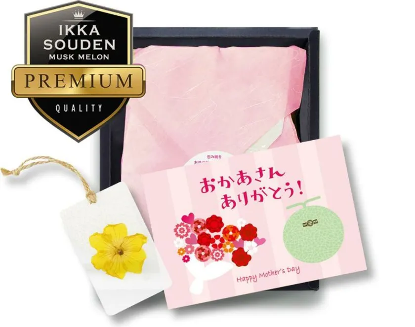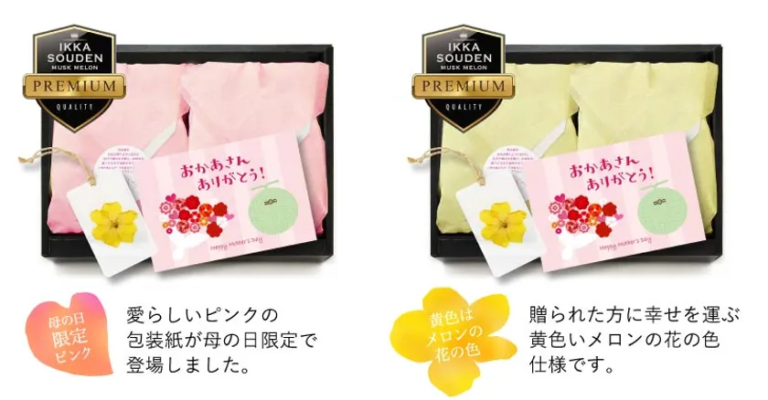 今回は母の日数量限定商品として、ピンク色の包み紙、メロンの花のしおり、ピンクリボン、メッセージカードを添えてお届け。メッセージはオリジナルでも制作可能で、当方での代筆も承ります。着日指定もできるだけご要望に沿った形で対応いたします。