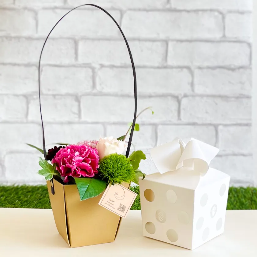 発売以来、エコロジーコンセプトとパッケージの可愛さ、チョコレートの美味しさを兼ね合わせ高い評価をいただいているカラフルショコラ プレゼントボックス。身近な大切な方へのプレゼントとして、来る母の日に合わせてお花のアレンジメントとのセット商品をお作りいたしました。