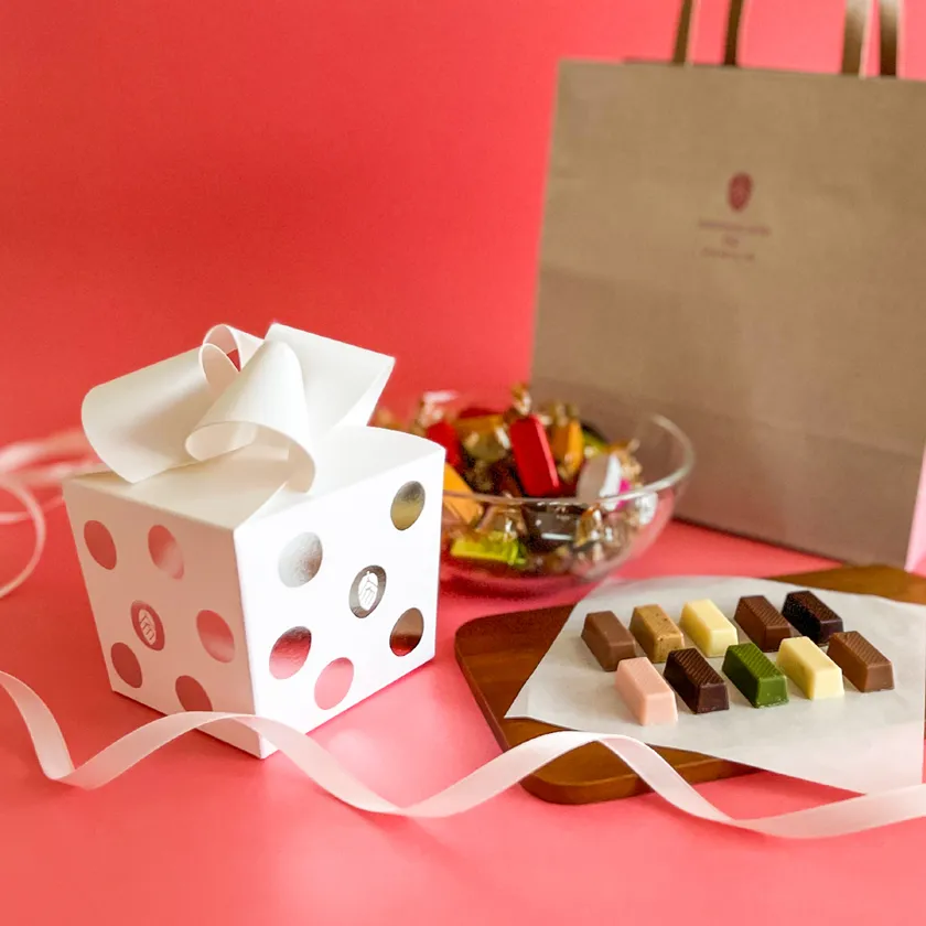 ミルク、スイート、ホワイト、紅茶、モカ、抹茶、ほうじ茶、ストロベリー、ゆず、きな粉の10種類の一口サイズのチョコレートが50粒ぎっしり入ったオリジナルボックス。ひと粒ひと粒、幸せな余韻を残しながらも、お口の中ですっと溶けていくベストなサイズを追求。口どけがとてもまろやか。10種のフレーバーは、数ある候補の中からチョコレートに合う素材として厳選。抹茶やほうじ茶をはじめ、ゆず、きな粉など日本オリジナルの素材を仲間に入れ、日本のチョコレートらしさを表現。それぞれのフレーバーと、また何よりもチョコレートの味を一番引き立たせる黄金スポットにこだわった配合で、どなたにも気軽に楽しんでいただける一口チョコレートです。