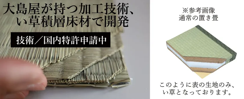 本畳といえば、通常部屋に固定するので重量がありサイズが大きく、持ち運びが大変です。今、市場に出回っている置き畳は素振りをするとなると耐久性が劣ります。そこで当社独自(国内特許申請中)のい草の積層構造で、程よいクッション性と足指で畳を掴まえやすい、スポーツ専用畳『Swing-畳シリーズ』を開発いたしました。