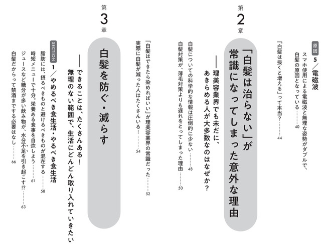・白髪対策に特化し、直接髪や頭皮に働きかけるといった正攻法を1冊にした本は、今までありませんでした。