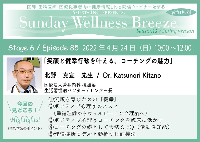 セリスタ株式会社(東京都千代田区、代表取締役:伊藤 承正)は、2022年4月24日(日)に、北野 克宣先生(医療法人菅井内科 抗加齢・生活習慣病センター/センター長)を講師に迎え、医師・歯科医師・薬剤師・医療従事者限定無料Zoomオンラインセミナー『笑顔と健幸行動を叶える、コーチングの魅力』を開催します。