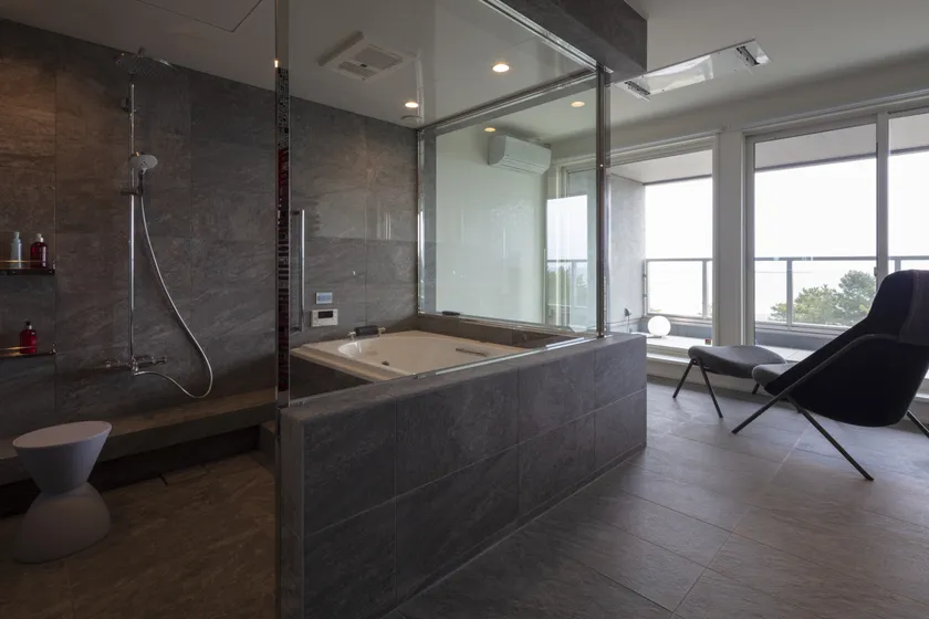 リゾートホテルをイメージしたガラスで間仕切られたジャグジーからは、バルコニー越しに視線が海へ抜けていく