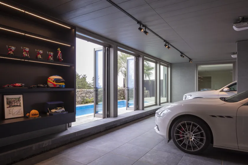 3台分のビルトインガレージは庭とプールに繋がる