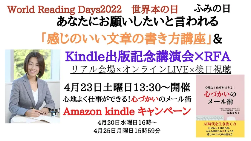 世界本の日(世界読書デー):ふみの日 あなたにお願いしたいと言われる 「感じのいい文章の書き方講座」& Amazon Kindle出版記念講演会×リードフォーアクション読書会