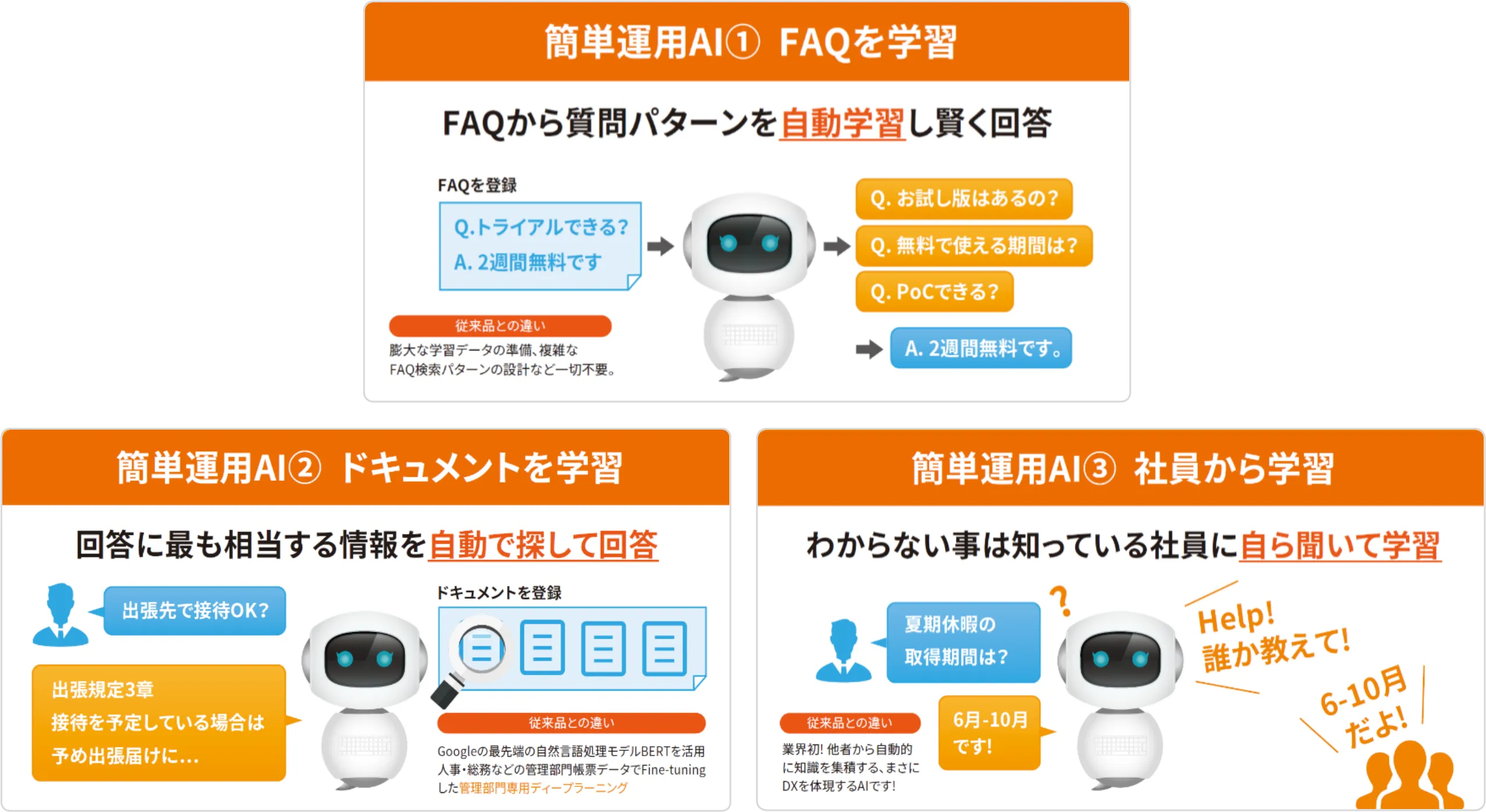 専門知識がなくとも基本的なFAQ※一式を登録するだけで、独自開発のAIが派生シナリオを自動で学習・生成し、手間やコストをかけることなく短期間で効果を発揮する“即戦力”なAIチャットボットサービスです。