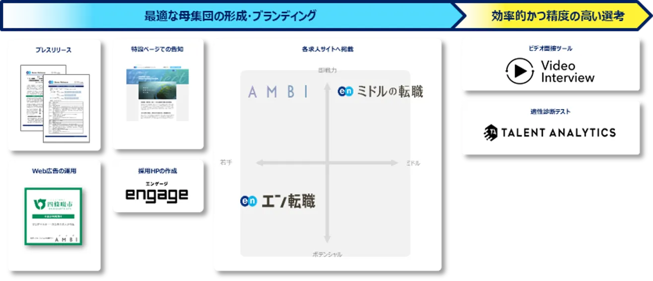 プレスリリースや特設ページ、採用HPの作成、Web広告での告知に加え、各求人サイトでの集客サポートを実施いたします。『エン転職』『AMBI』『ミドルの転職』とターゲットの異なる3つの求人サイトを活用することで、ターゲットへ網羅的に求人を届けます。ビデオ面接ツール『VideoInterview』、WEB適正テスト『タレントアナリティクス』も提供。選考フローの支援を通じて、求職者と同市の適切なマッチングを実施します。