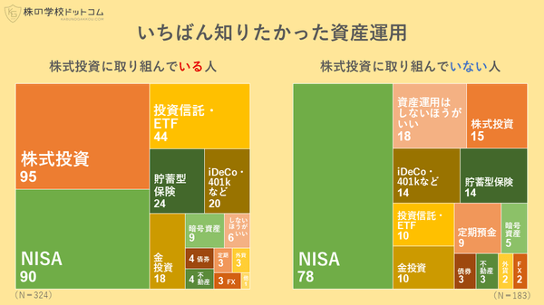このうち「いちばん知りたかった」ことに選ばれたのは、株式投資に取り組んでいる人では95人(29.3%)が回答した「株式投資」が第1位。「NISA」は90人(27.8%)で、「投資信託・ETF」は44人(13.6%)でした。株式投資に取り組んでいない人でも、78人(42.6%)が選んだ「NISA」が断トツのトップとなっています。