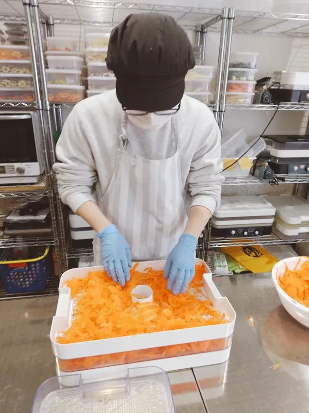 コロナ禍において、障害施設への作業などが激減していること、また外部受注の作業は時期による仕事量の増減があることなどから、安定した仕事の確保をする為、自社のオリジナル商品を作ることとなりました。その中で、作業する人たちやスタッフが楽しく、かつプライドを持って、作った商品が売れる喜びを得られるもの。買う人も、障害者が作ったものではなく商品として買っていただけるもの。作業が簡単で工程がいくつもあるもの等々に、当てはまったのが乾燥野菜・果物でした。そこから1年以上かけて、カット方法や乾燥温度・時間・食品検査・パッケージ・作業工程などを作り上げました。
