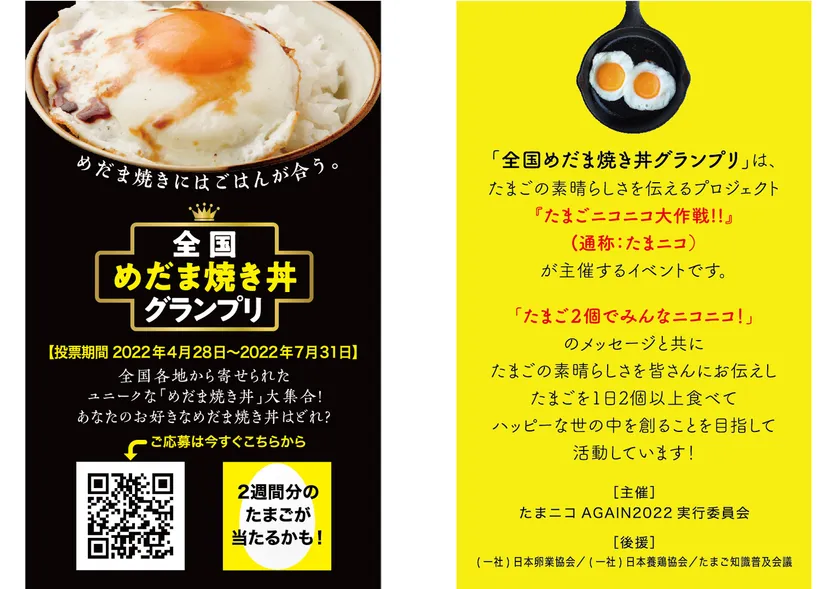 国内のたまご生産・流通の次世代の担い手で構成する、日本のたまごの盛り上げ団体「たまニコAGAIN2022実行委員会」(通称:たまニコ実行委員会、実行委員長:野田 裕一朗)は、一般社団法人日本卵業協会、一般社団法人日本養鶏協会、たまご知識普及会議など全国のたまご関係者の協力を得て、『全国めだま焼き丼グランプリ』を2022年4月28日から7月31日まで、特設サイト( https://sites.google.com/view/tamanikoagain2022 )で開催します。